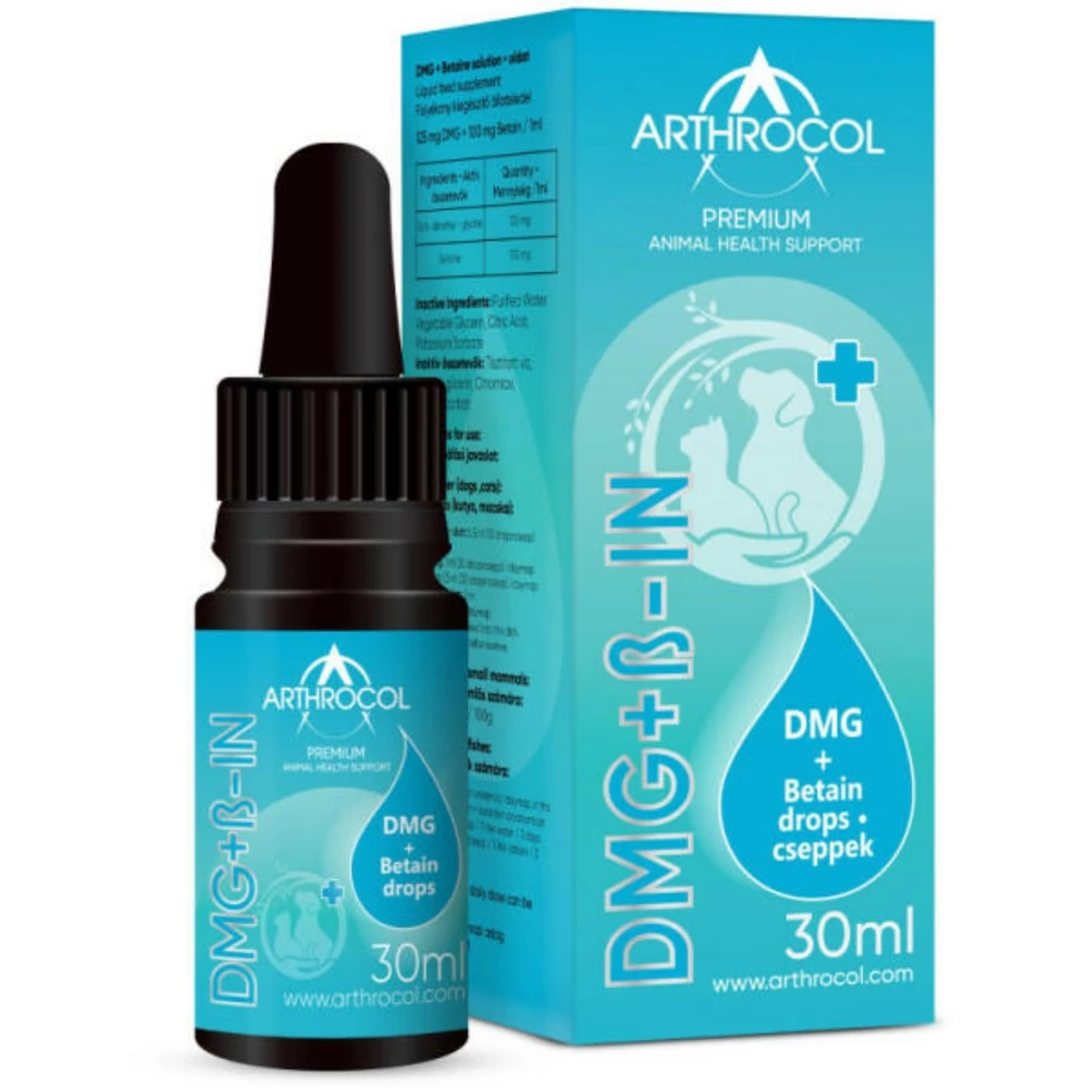 Az Arthrocol DMG+ Betaine egy oldat, amely kifejezetten az immunrendszer támogatására lett kifejlesztve, mind kutyák, macskák és kisemlősök számára megfelelő. Elősegíti az állatok immunfunkcióinak erősítését, valamint a gyógyulási folyamatokat. Az étvágy növelésében és a háziállatok általános egészségi állapotának javításában is hatékony. Alkalmazása javasolt lehet fertőző betegségek esetén, mint kiegészítő terápia. Hozzájárul a házi kedvencek fizikai teljesítményének és az idősebb állatok életerejének növeléséhez. A szív és máj működését is támogatja. Jótékony hatású lehet a rák elleni harcban az állati szervezet számára. Összetétel: 1 ml tartalmaz: N,N-dimetilglicin (DMG) 125 mg, Betain anhidrát: 100 mg, citromsav, glicerin, kálium szorbát, tisztított víz Célállat fajok: kutya, macska, kisemlősök. Alkalmazás módja: Használat előtt felrázandó! Szájon át eleségbe keverve, vagy közvetlenül beadva alkalmazható. Általános adagolás Kutya, macska: 10 ttkg alatt: 0,5 ml (10 csepp) naponta 10 – 20 ttkg: 1 ml (20 csepp) naponta 20 – 30 ttkg: 1,5 ml (30 csepp) naponta 30 ttkg felett: 2 ml (40 csepp) naponta Kisemlősök: 1 csepp / 100 gramm