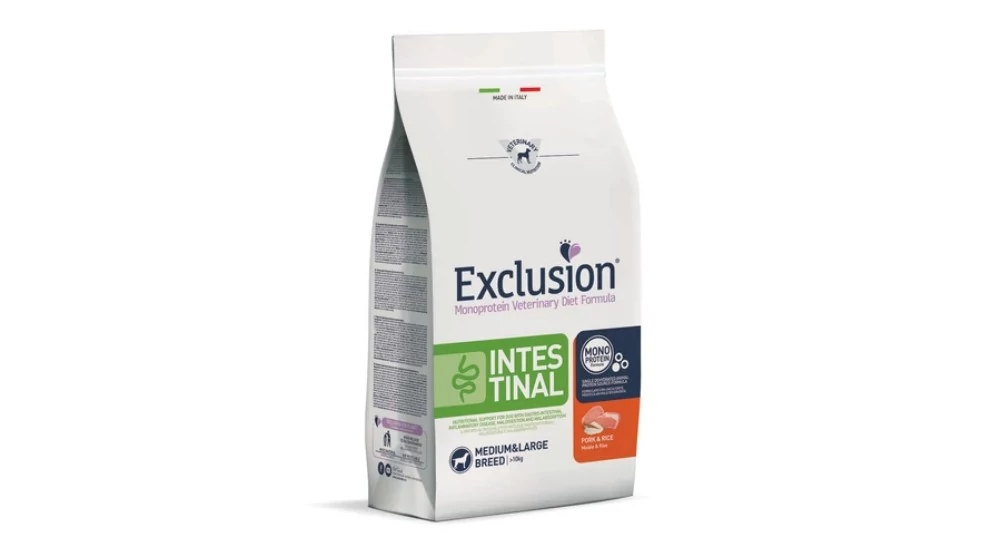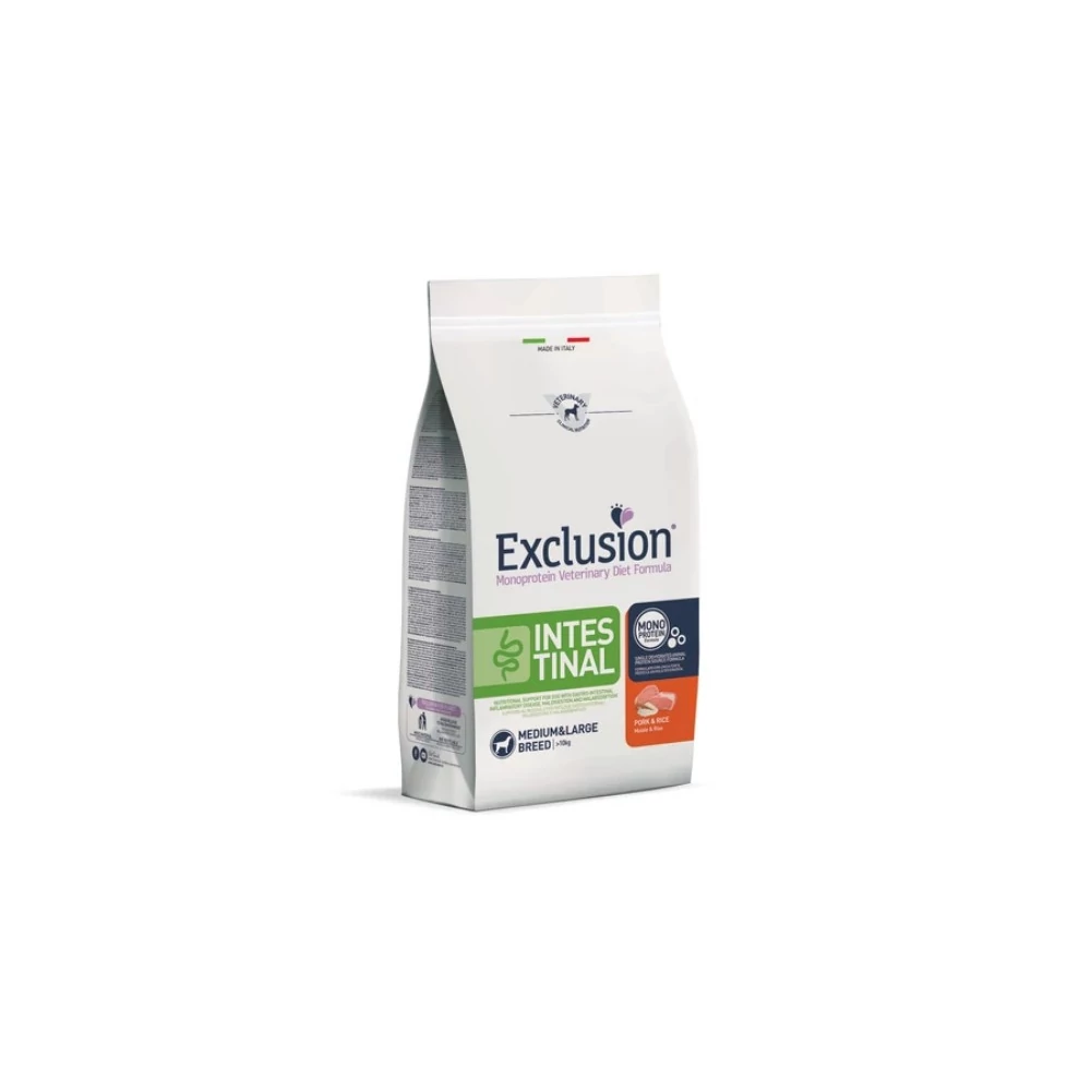 Exclusion Diet Intestinal Pork and Rice egy teljesértékű diétás eledel felnőtt kutyák részére, melyet az akut bélrendszeri felszívódási (abszorpciós) rendellenességek csökkentésére, a rossz emésztés kiegyenlítésére fejlesztettek ki. Ez a diétás eledel megnövelt elektrolittartalommal, könnyen emészthető összetevőkkel és alacsony zsírtartalommal rendelkezik. INTESTINAL: étrendi támogatás maldigestio, malabszorpció, valamint gasztrointesztinális rendellenességek esetén MONOPROTEIN FORMULA: egyetlen állati eredetű fehérjeforrás tartalom, a táplálék intolerancia minimalizálása érdekében. Tápjainkban az összetevők dehidratált formában vannak jelen, a magasabb táplálékbevitel érdekében. ÖSSZETÉTEL: rizs (51%), dehidratált sertés (25%), sertészsír, szárított cikória, dehidratált lucerna, monokalcium-foszfát, sörélesztő (3%), kálium-klorid, borsó rostok, lenmag, nátrium-klorid, mannán- oligoszacharidok (0,3%), frukto-oligoszacharidok (0,2%), psyllium mag és maghéj, ß-1,3/1,6 glükán élesztő sejtfalból Saccaromyces cerevisiae (0,07%).